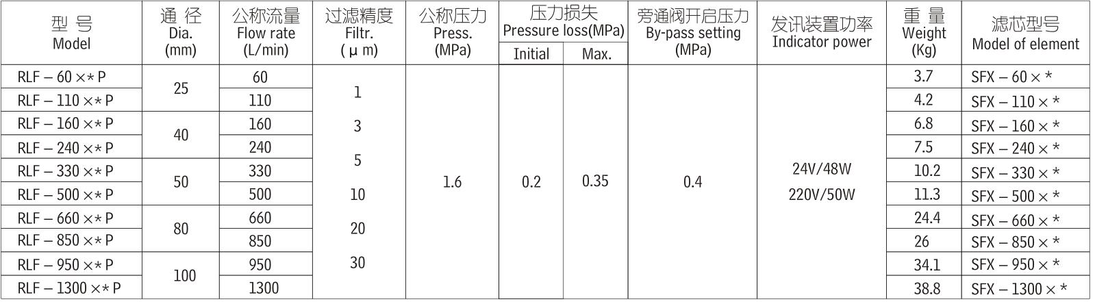 注:*為過(guò)濾精度 如過(guò)濾油液為一般液壓油,流量240L/min、精度10微米,配置發(fā)訊器 型號(hào)為RLF-240*10P,濾芯型號(hào)為SFX-240*10